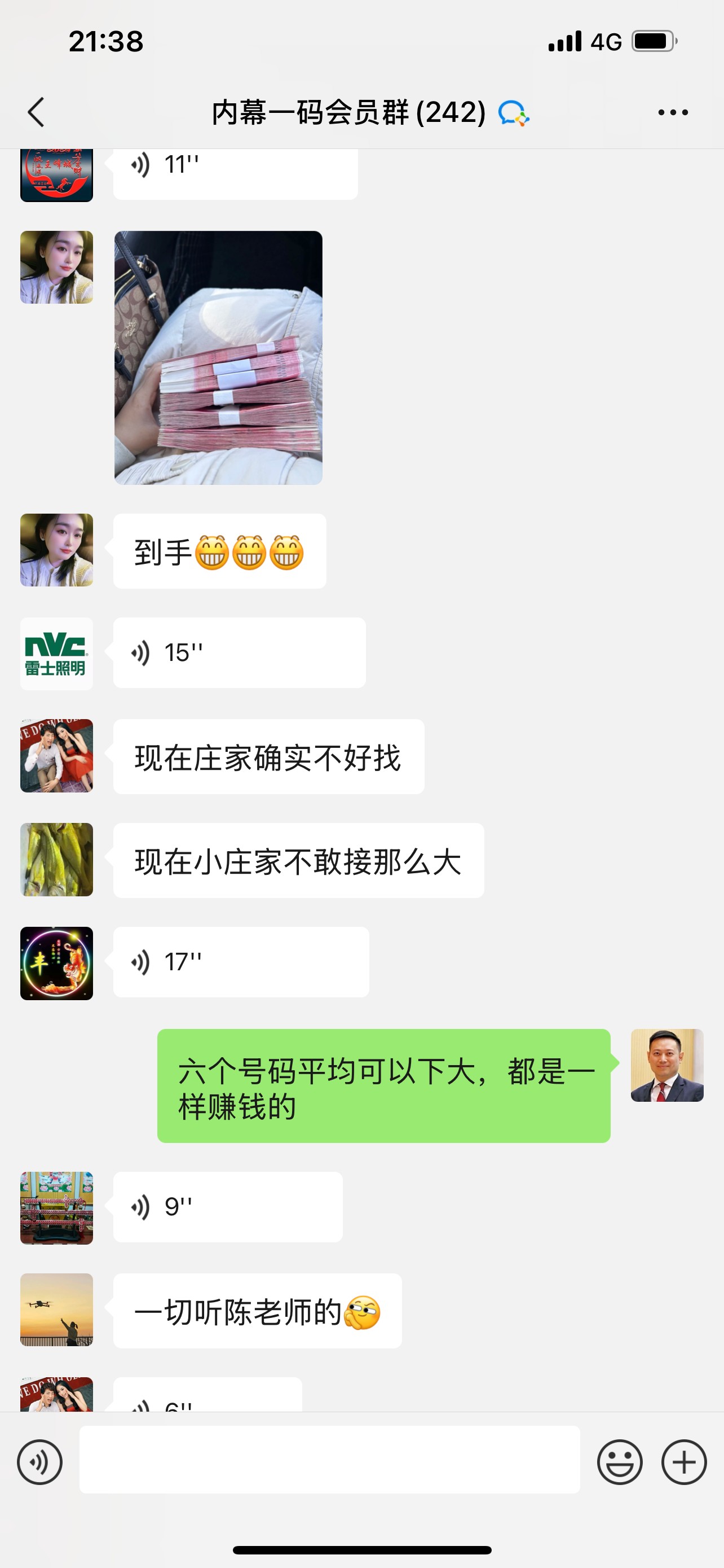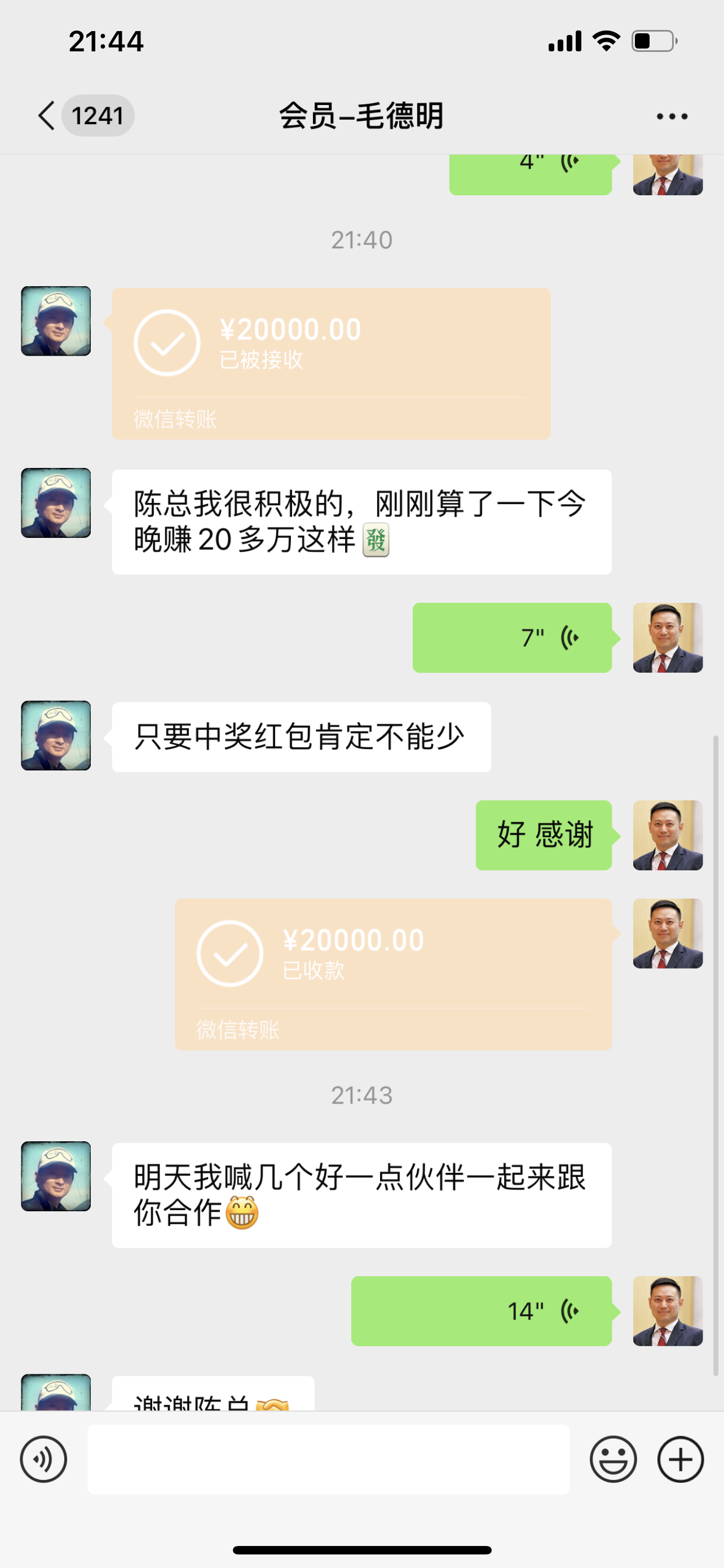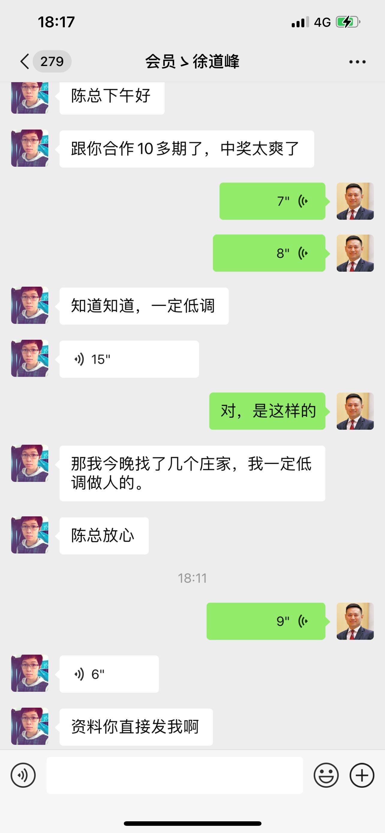 陈总你的资料太准了,昨晚中的钱刚从庄家那里拿回来,没找你之前输了十几万了,昨晚总算中回来一点了,以后就跟着你赚钱了。红包少不了你的,等我还清债务就发大红包感谢陈总!