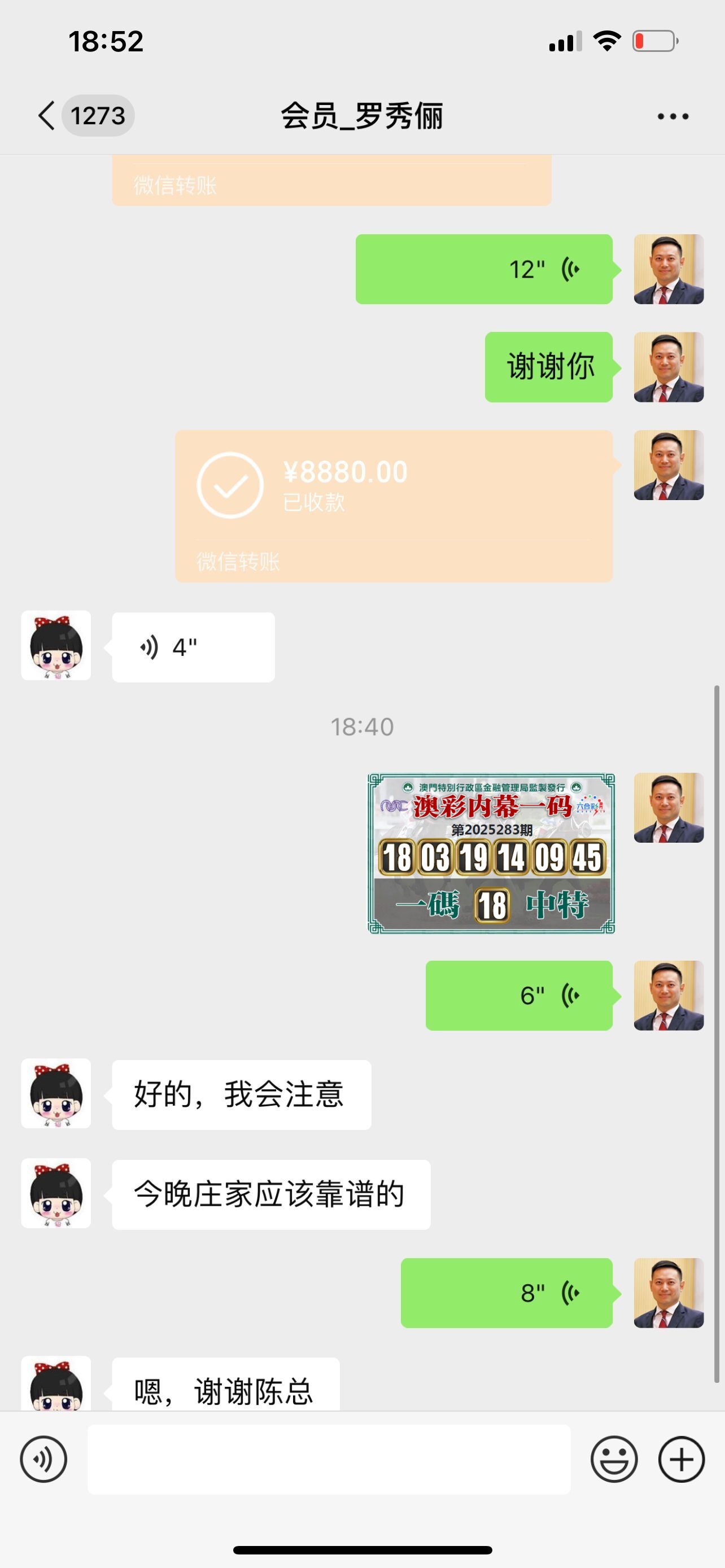 感谢陈总的帮助,我上期收获满满,今天我已经联系了三个庄家,今晚等着跟你继续下大大的。我刚刚给您转了个一万八的红包,请您查收,祝你新的一周工作顺利。