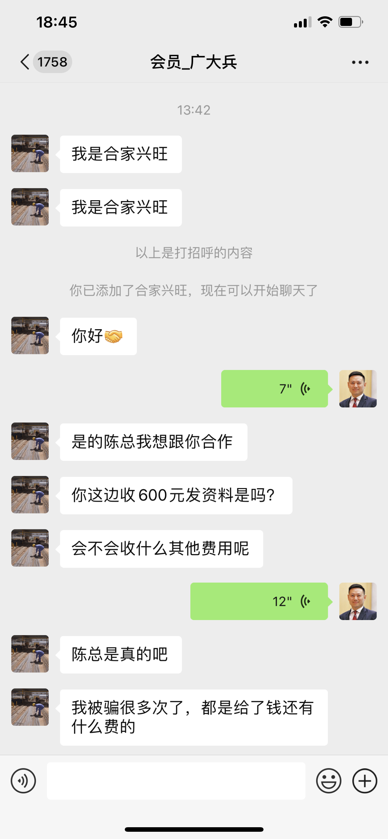 陈总,我看到这么多人跟着你都能中奖都可以赢那么多钱,我觉得我的人生都跟他们经历的差不多,失败过成功过,人生总会有大起大落的,这些我亲身经历过,落魄的时候个个都避而远之,辉煌的时候瞻前马后,现在我可能在经历我人生最难过的一关,公司马上面临倒闭,资金一时周转不了,请陈总帮帮我,会员我已经办理好了,在这里先谢谢陈总了。