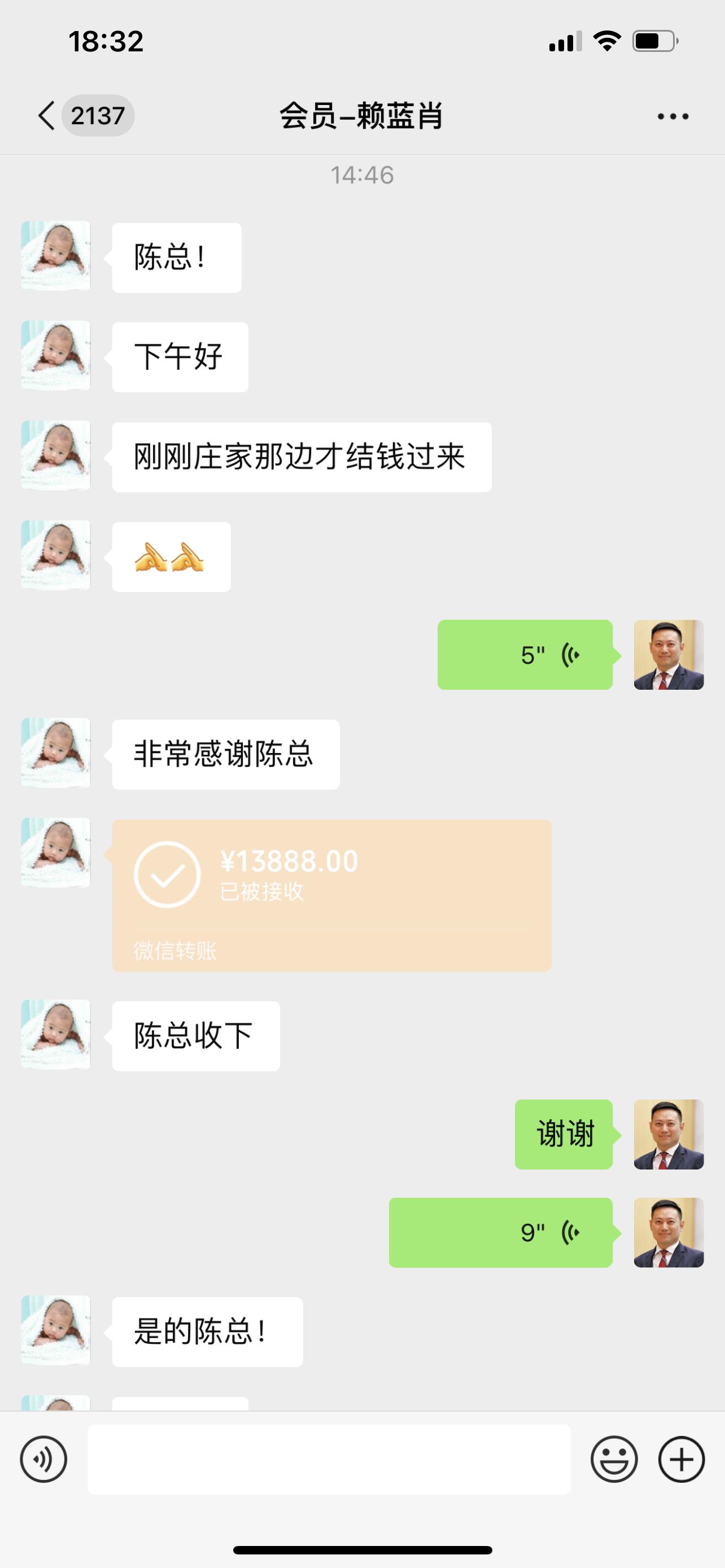 在陈总的带领下,我不但把我之前的欠款还清了,现在还给我儿子买了套房,真心感谢,我还有5期的合作就到期了,我会在接下来的期限里多找几个庄家下注的,争取赢多点回来,多谢您的厚爱,红包28888元已经给你转到您工商卡上了,感谢大恩人!