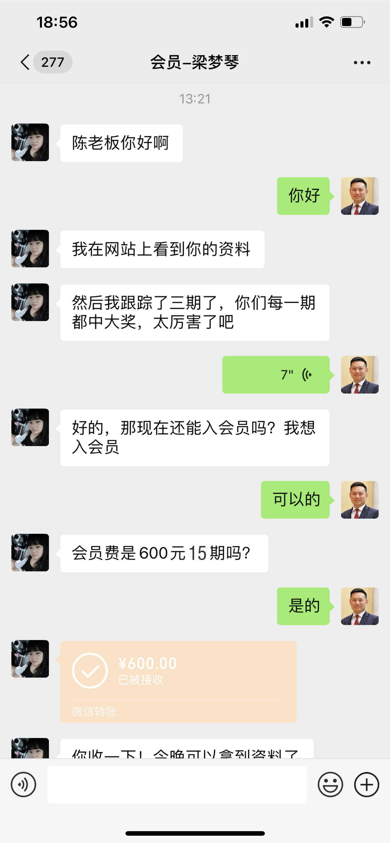 陈总早上好!我昨晚给你打过电话了,刚才已经给你转了600元入会的费用,麻烦陈总帮我办理好会员,明天就等你发资料给我了,我现在输的身无分文,我看见了大家对你的评价,在你的帮助下不少广大彩民把钱赢回来了,我也希望你能帮到我,我外债欠了20多万,天天有人催债,心好烦,在此先谢谢陈总了,等我赢到钱之后我给你汇个大红包感谢你,合作愉快!